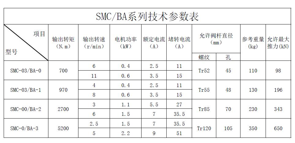 SMC/BA系列電動裝置是SMC系列中小轉(zhuǎn)矩多回轉(zhuǎn)電動裝置與BA圓錐齒輪減速器的一種組合型式,它適合閘閥、截止閥等多回轉(zhuǎn)閥門的驅(qū)動控制。SMC/BA電動裝置具有以下特點:以較小轉(zhuǎn)矩規(guī)格的SMC電動裝置與BA減速器組合可獲得更大的輸出轉(zhuǎn)矩。在輸出轉(zhuǎn)速允許的條件下,選用該產(chǎn)品能夠提高所選電動裝置規(guī)格的通用性,便于產(chǎn)品的使用、維護。
