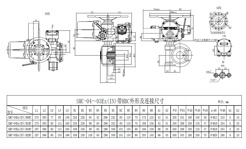 SMC/HBC系列電動裝置是SMC系列多回轉(zhuǎn)電動裝置與HBC蝸輪減速器的組合型式,它適合球閥、蝶閥等部分回轉(zhuǎn)閥門的驅(qū)動控制。SMC/HBC電動裝置具有以下特點:結(jié)構(gòu)設(shè)計堅固可靠,產(chǎn)品規(guī)格齊全,驅(qū)動轉(zhuǎn)矩范圍大且動力輸出穩(wěn)定, 具有良好的自鎖性能。 HBC輸出軸結(jié)構(gòu)獨特,裝有與閥桿連接的漸開線花鍵接頭,產(chǎn)品的安裝調(diào)試方便。