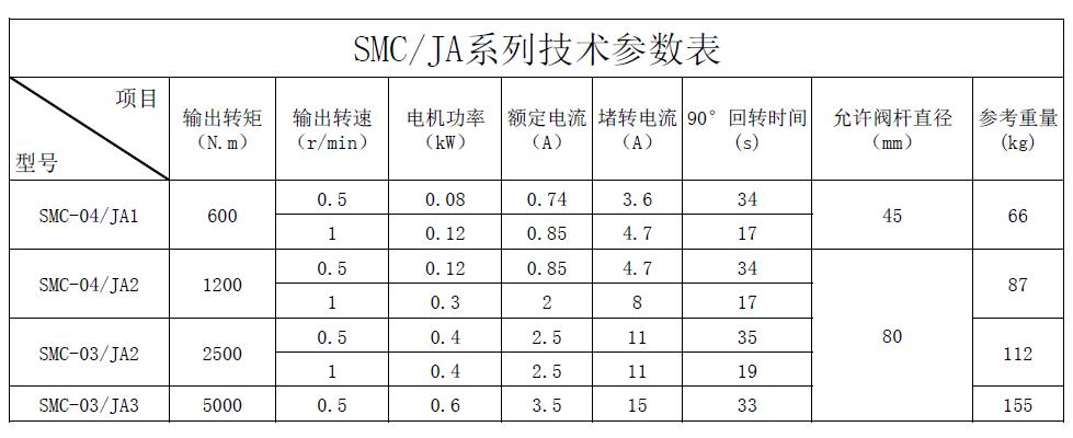 SMC/JA系列閥門電動(dòng)裝置是部分回轉(zhuǎn)型閥門電動(dòng)裝置,適用于球閥、蝶閥等類型閥門以及電動(dòng)風(fēng)門。其結(jié)構(gòu)形式為組合式,由SMC多回轉(zhuǎn)電動(dòng)裝置與JA部分回轉(zhuǎn)減速裝置相組合而成。該系列產(chǎn)品所適用的環(huán)境條件、溫度、濕度、海拔、防護(hù)等級(jí)均能達(dá)到SMC相應(yīng)規(guī)格產(chǎn)品的水平。